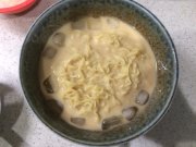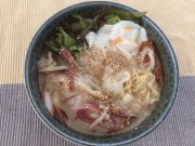 うp主 2021年08月09日 14:59 スープに豆乳を使った冷やし味噌ラーメンです。 それに大根おろしを加え、薬味はミョウガで決まり。 豆乳、大根おろし、ミョウガ。なんだか体に良さそうな冷やしラーメンになりました。 豆乳のまろやかさと大根おろしの辛みがほどよく調和していて、あっという間に完食。特に暑い日にお勧めです。 前回ポーチドエッグが理想的に仕上がって油断したのか、今回はこの有様… (笑)